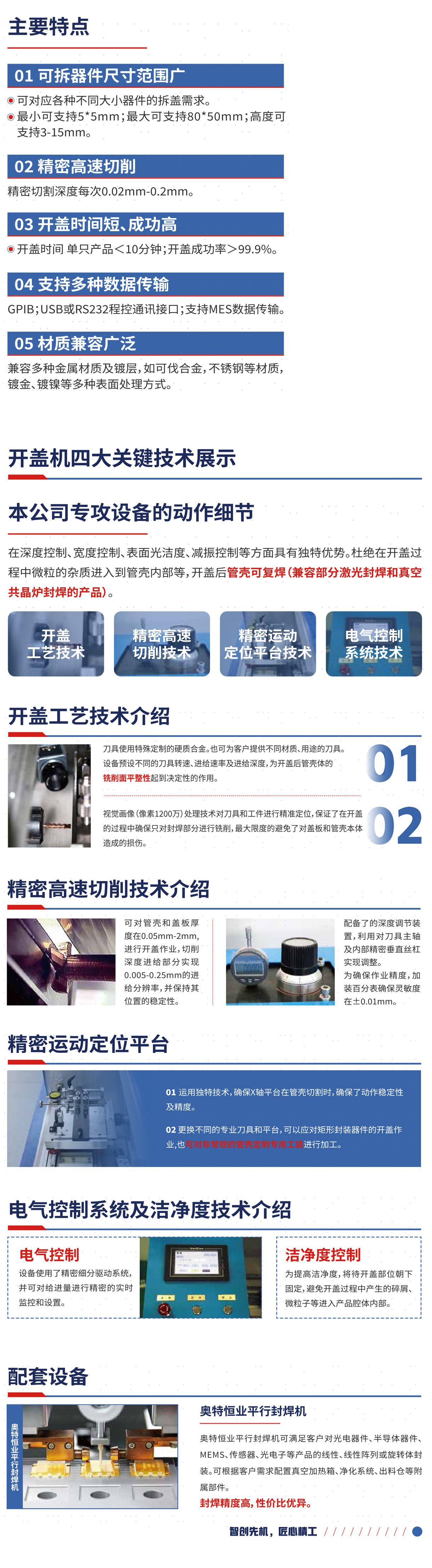 開蓋機,可對各廠家金屬管殼和陶瓷金屬化管殼,蝶形和BOX類形式的封裝進行返修,涵蓋微波、射頻類器件、傳感器&光電器件、厚膜電路、光通信器件、石英晶體振蕩器等産品進行開蓋作業。開蓋後管殼可複焊(兼容部分激光封焊和真空共晶爐封焊的産品),開蓋後重新封蓋,滿足GJB548B氣密要求。